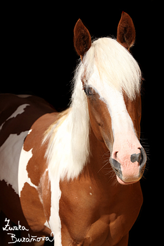 , 2009, černé pozadí, jeden, klisna, klisna gentle dun it queen, koukání, léto, na výšku, paint horse, portrét, slunečno, strakáč, |