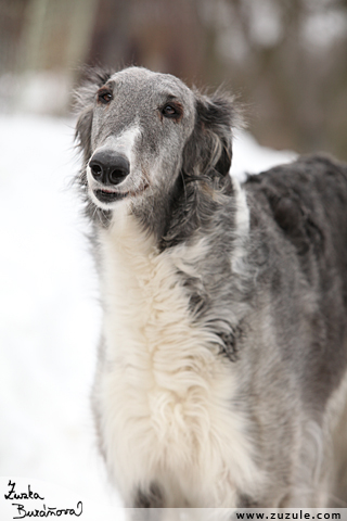 , 2010, barzoj – ruský chrt, dospělý pes, jeden, na výšku, portrét, sníh, stání, uljana z palatinu moravia, zataženo, zima, |