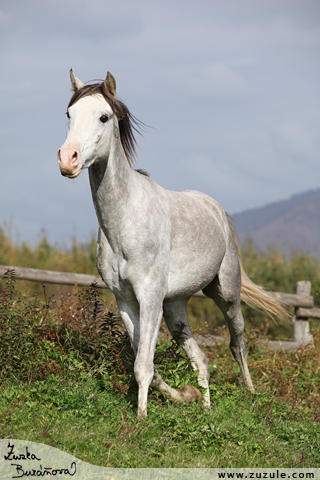 , 2010, arabský plnokrevník, celý kůň, hřebec, jeden, klusání, na výšku, podzim, slunečno, šedák, umar, výběh, |